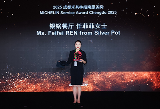 来自米其林一星餐厅银锅的任菲菲女士获得本届成都米其林指南服务奖。生长于四川的任菲菲,对家乡菜肴和食材有着深刻理解。她能够为顾客进行详尽的介绍,特别对各种四川花椒的产地、香气和用途,以及四川胡椒茶的历史和风味了如指掌。其专业知识和对川菜的热情提升了顾客的用餐体验。