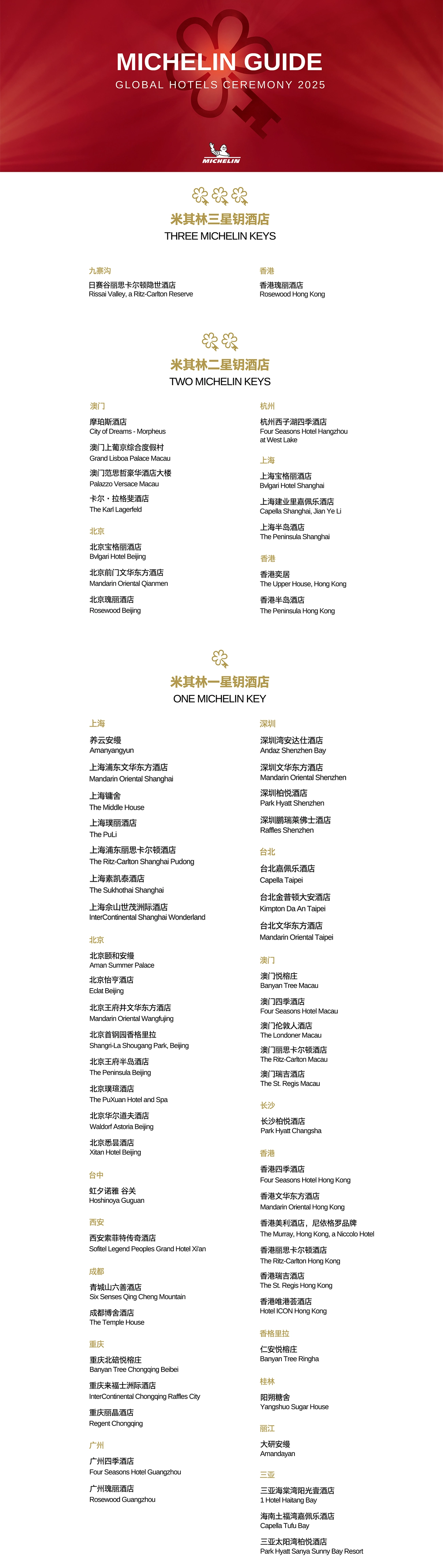首度入选全球米其林星钥榜单即获最高三星钥殊荣的两家中国酒店分别为:香港瑰丽酒店与位于四川省九寨沟的日赛谷丽思卡尔顿隐世酒店。